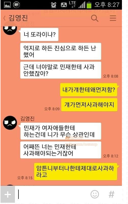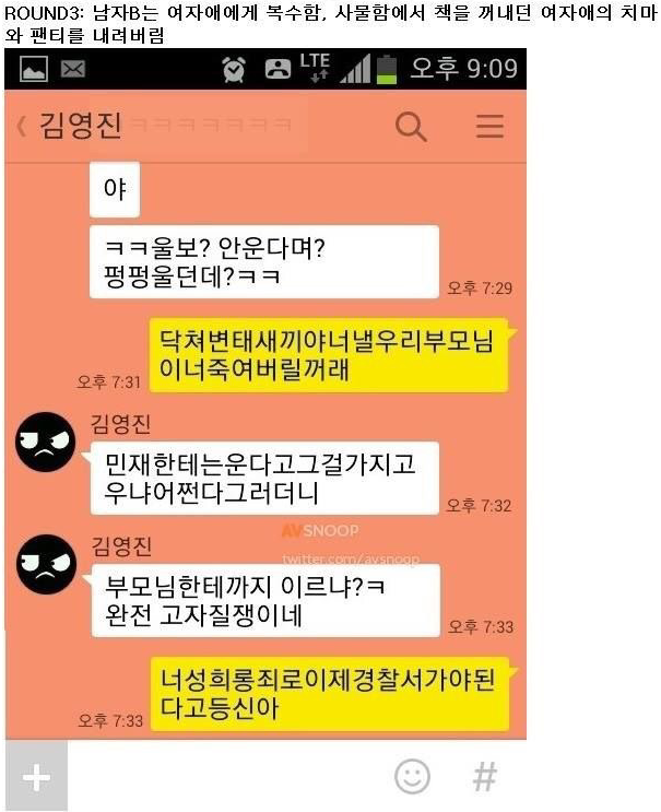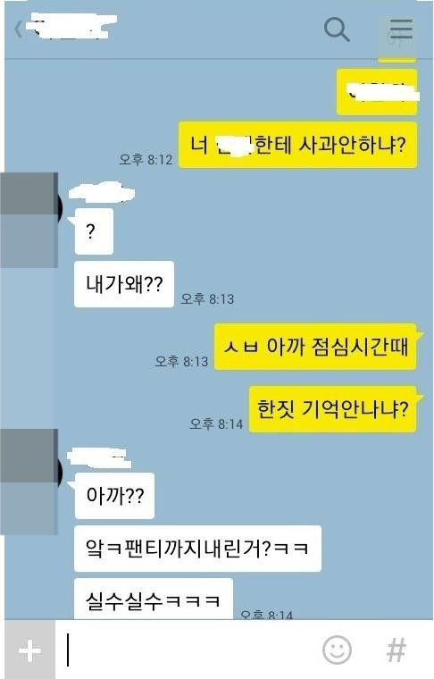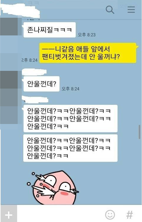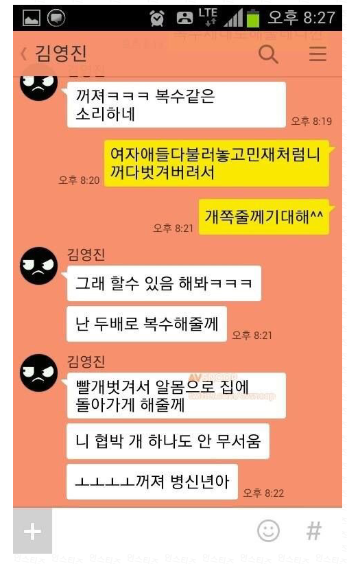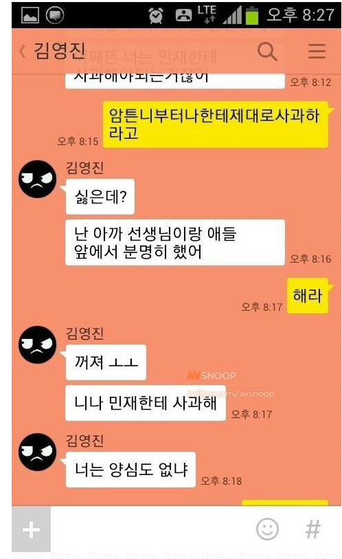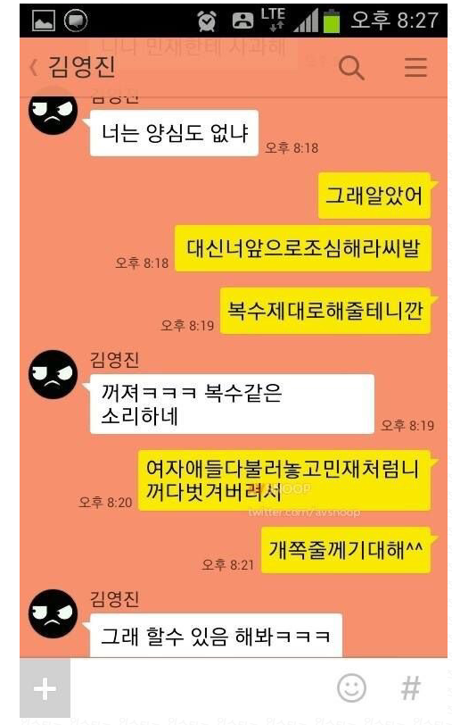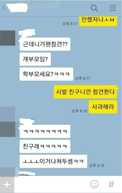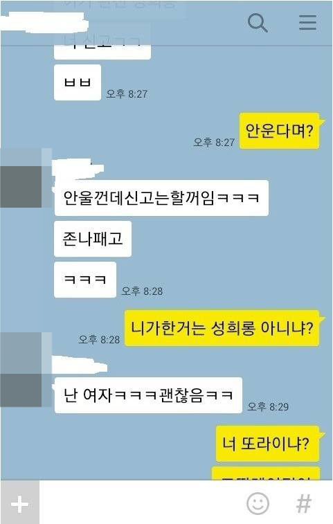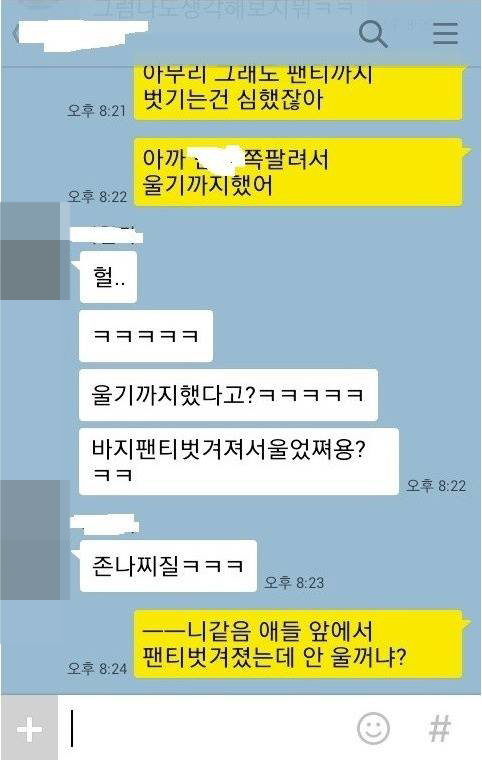 이어 “여자애들 거의 다 봤고 제 친구는 울었거든요? 근데 여자애는 미안하다는 말 조차 안했어요 제 친구가 너무 불쌍해요 아까 그 여자애한테 따졌는데 욕만하고 사과는 안하고 개무시하네요 이 여자애 경찰에 신고하고 싶은데 도와주세요 카톡 대화 내용 올릴게요” 라며 카톡 내용을 공개했다.