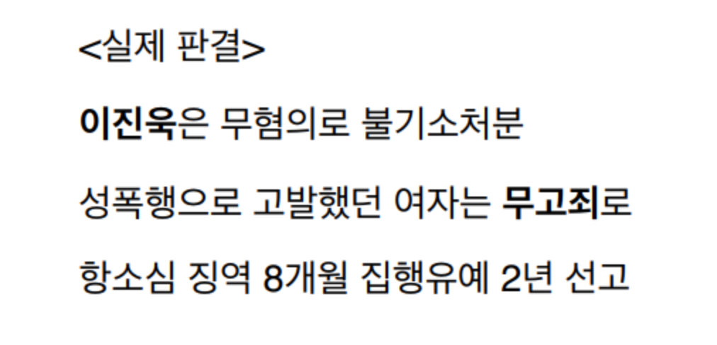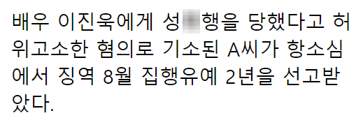 이진욱은 유죄 판결이 났으며, 상대 여성을 무고죄로 고소를 했다.