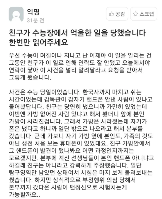 한 커뮤니티에 “친구가 수능장에서 억울한 일을 당했습니다 한번만 읽어주세요”라는 글이 올라왔다.