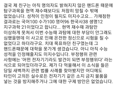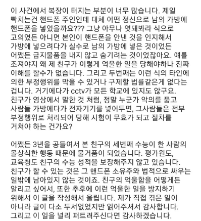 본부로 가보니 생전 처음 보는 휴대폰이 가방에 있어서 본인 핸드폰 아니냐고 본부에 계신 선생님들이 추궁을 하고, 친구는 아니라고 강력하게 주장해 일단 탐구영역만 남은 상태니 시험은 마저 보라고 했다고 한다.