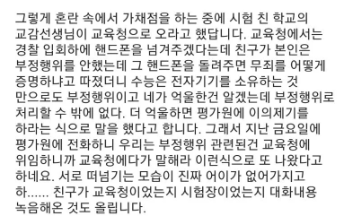 친구의 교감선생님이 교육청으로 오라고 했고, 교육청에서는 경찰 입회하에 핸드폰을 넘겨주겠다는데, 그 핸드폰을 넘겨주면 무죄를 어떻게 증명하냐고 따졌더니, 수능 법에 따라 부정행위처리를할 수 밖에 없다고 한다.