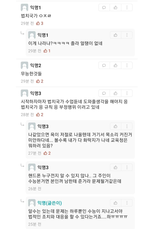 억울하면평가원에 이의제기를 하라고 해서 평가원에 전화하니 우리는 부정행위 관련 된건 교육청에 위임하니 교육청에 말해라 라고 서로 떠넘기는 모습을 보여 통화내용도 녹음 했다고 한다.