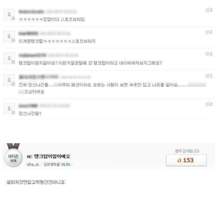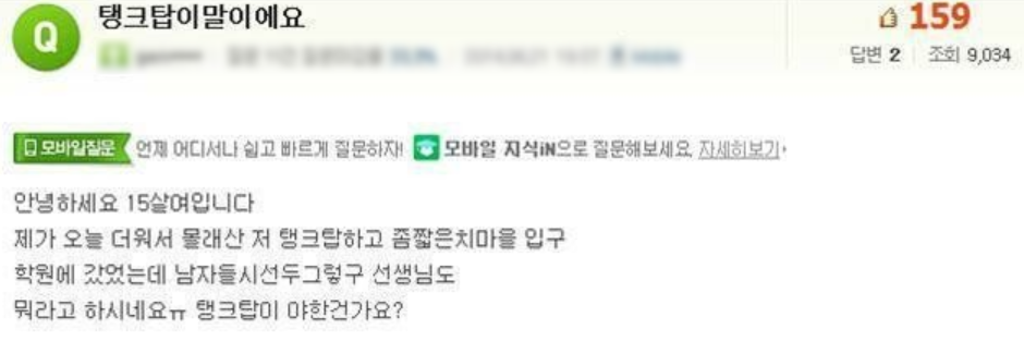 여중생은 “안녕하세요 15살여입니다. 제가 오늘 더워서 몰래 산 저 탱크탑하고 좀 짧은 침마를 입구 학원에 갔었는데 남자들 시선도 그렇구 선생님도 뭐라고 하시네요 ㅠ 탱크탑이 야한건가요?”라며 자신이 학원에 입고 갔다던 탱크탑의 사진과 고민을 털어놨다.