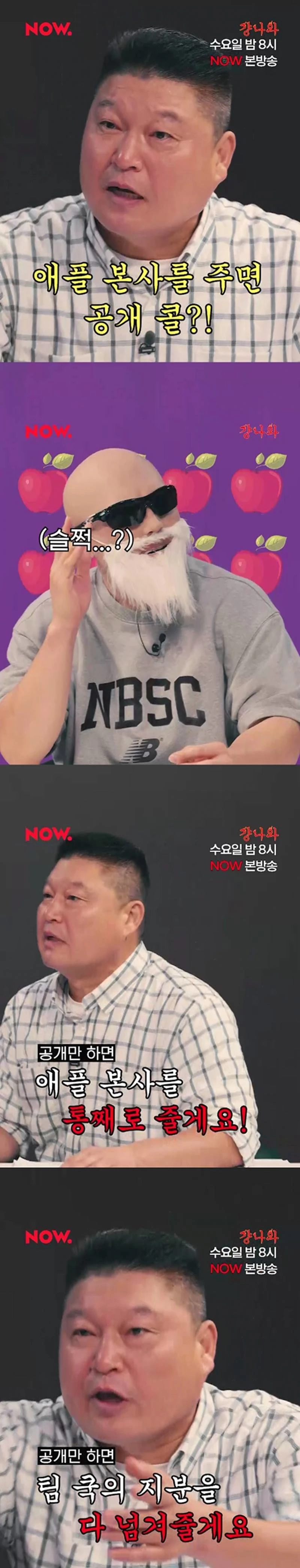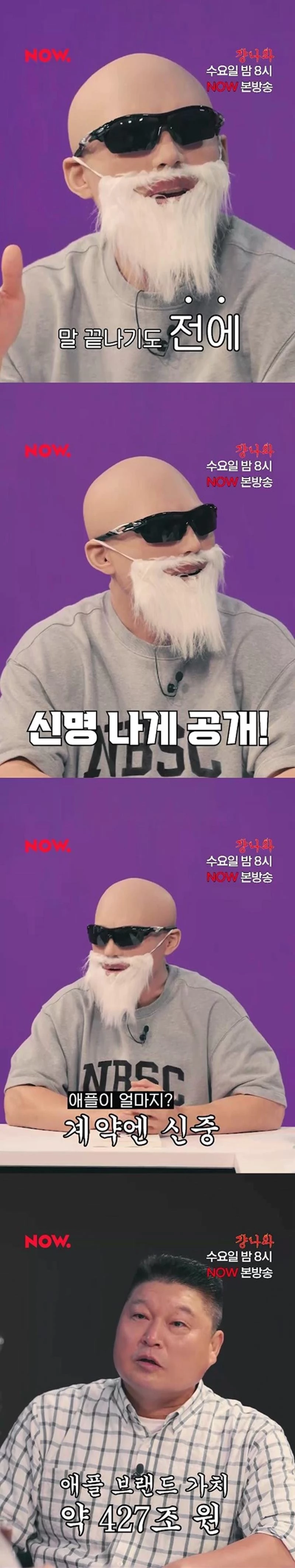 강호동은 “애플 본사를 주면 (얼굴을) 공개할 수 있냐? 팀 쿡의 지분을 다 넘겨주겠다”라고 장난스럽게 물었다.
