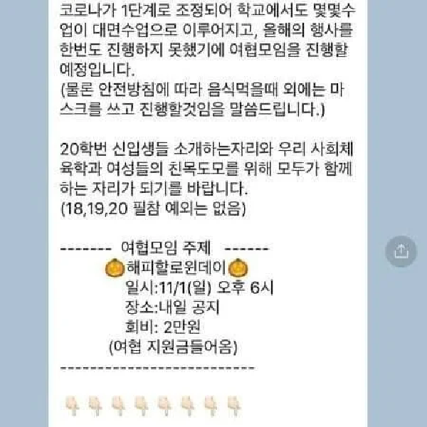 모임 날짜는 11월 1일 오후 6시다. A씨는 “20학번 신입생들 소개하는 자리와 우리 사회체육학과 여성들의 친목도모를 위해 모두가 함께하는 자리가 되기를 바란다”고 덧붙였다.