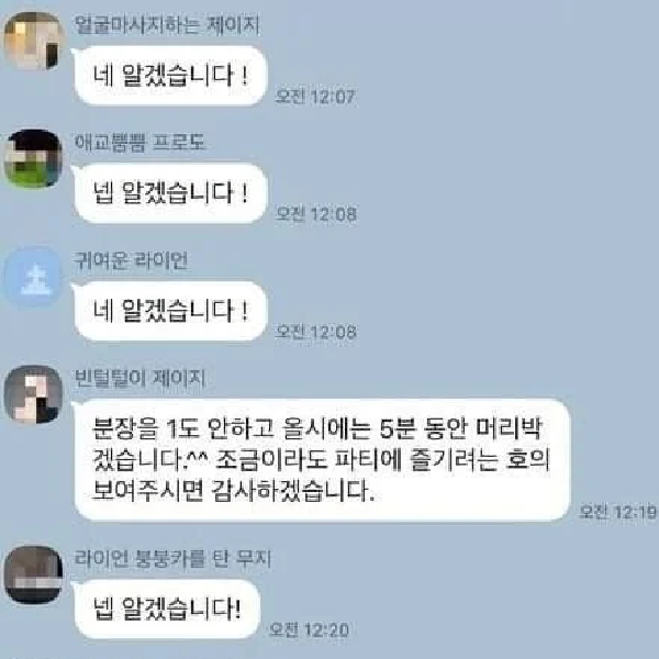 이에 학생들은 “네 알겠습니다”라며 답했다. 그러자 A씨는”분장을 안하고 올 시에는 5분 동안 머리 박겠습니다”라며 “조금이라도 파티를 즐기려는 호의를 보여주시면 감사하겠다”고 협박성 멘트를 남겼다.