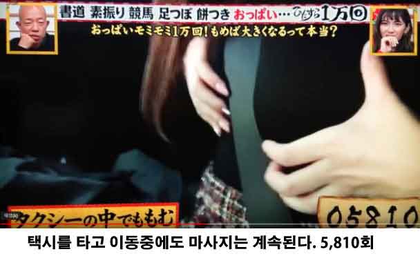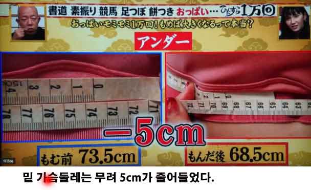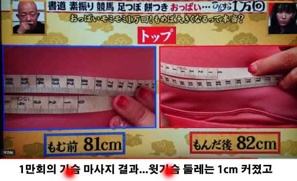 1만회의 가슴 마사지 결과 실제로 윗가슴 둘레는 1cm 증가했고, 밑 가슴 둘레는 무려 5cm가 줄어들어 D컵에서 E컵으로 사이즈가 증가해 놀라움을 안겼다.