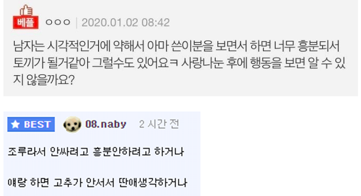 이 글이 올라오자 네티즌들은 “남자는 시각적인거에 약해서 너무 흥분돼서 그럴수도 있다, 사랑나눈 후 행동을 보면 알 수 있지 않을까요”, “흥분 안하려고 하거나, 딴애생각하거나다”등의 반응을 보였다.