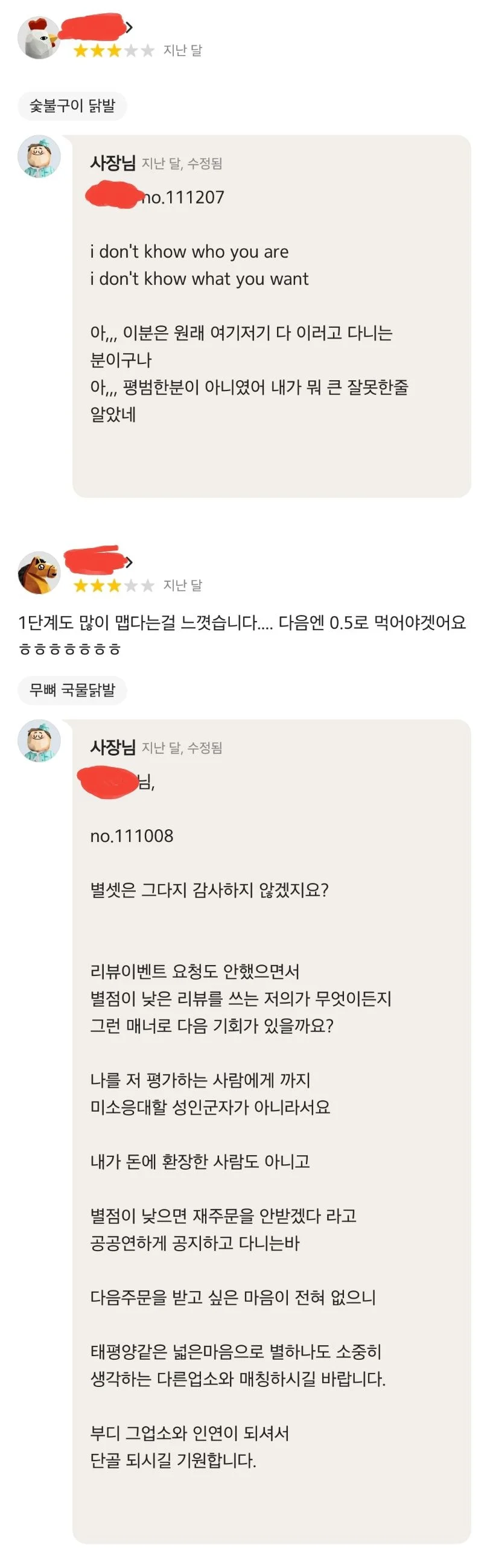실제로 소비자가 별점을 5점 보다 낮게 주면 대댓글로 서슴없이 지적을 가했다.