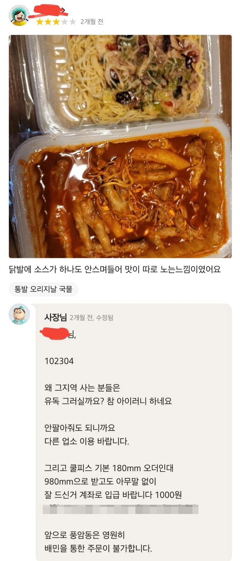 A사의 사장님은 “평점 깍을 목적으로 별점 낮은 리뷰 작성시 재주문이 거절되며 더불어 친분 있는 서구의 모든 업소 커뮤니티에 사례 공유 하겠다”고 협박성 말을 전했다.