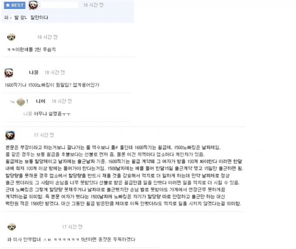 “일단 부장이라고 하면 잘 나가는 룸일테고 풀싸.롱일텐데 1600찍기는 월급제며 1500노빠킹은날짜제. 룸 같은 경우는 보통 월급을 후불보다는 선불로 먼저 주고 지역, 업소마다 차이가 있다. 월급제는 보통 할당제고 날짜제는 출근날짜 기준. 1600찍기는 계약때 그 여자가 방을 100개 봐야한다 이러면 한달 내에 최저 100개 이상 방에 들어가야함.1500날짜제는 예를 들어 한달 15일 출근계약 맺고 15일만 출근하면 됨.”