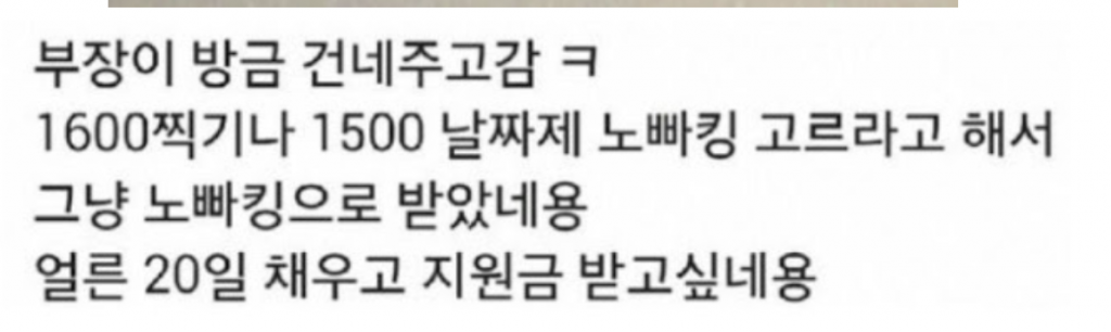 그리고는 “부장이 방금 건네주고감 ㅋ 1600찍기나 1500 날짜제 노빠킹 고르라고 해서 그냥 노빠킹으로 받았네용 얼른 20일 채우고 지원금 받고 싶네용”이라며 여대생의 직업을 짐작할 수 있는 내용의 글을 올렸다.