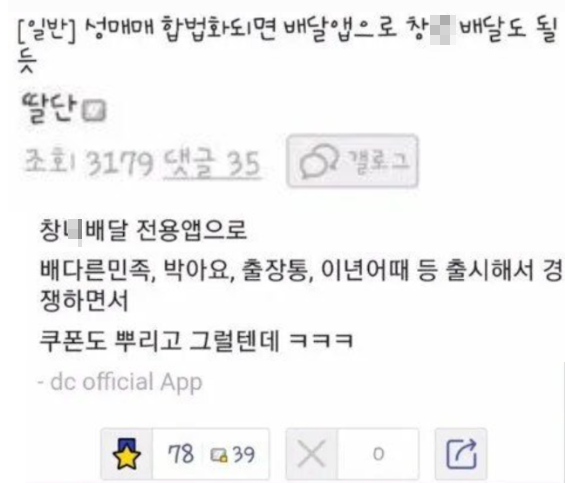 해당 작성자는 “성ㅁHㅁH 합법화되면 배달앱으로 창X 배달도 될듯”이라며 글을 적었다.