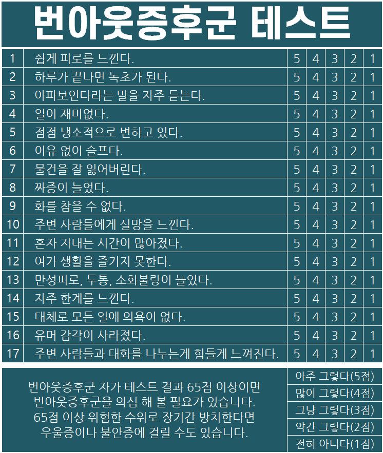 아래의 문항들 중 65점 이상이면 ‘번아웃 증후군’일 위험이 크다.