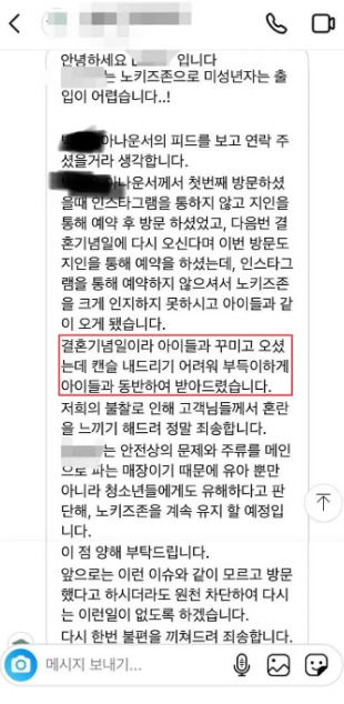 그 식당은 노키즈존이여서 혹시나 하는 마음에 식당에 문의를 했지만 식당 측에선 단칼에 노키즈 존이라 룸 예약도 불가하다고 상황을 설명했다.
