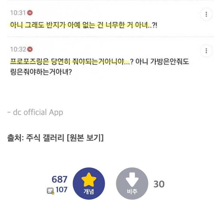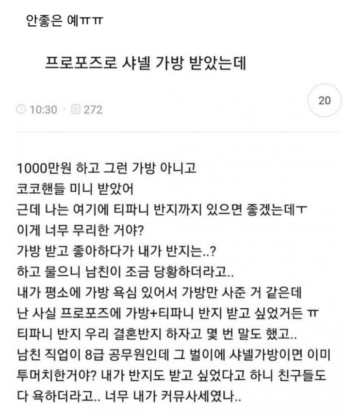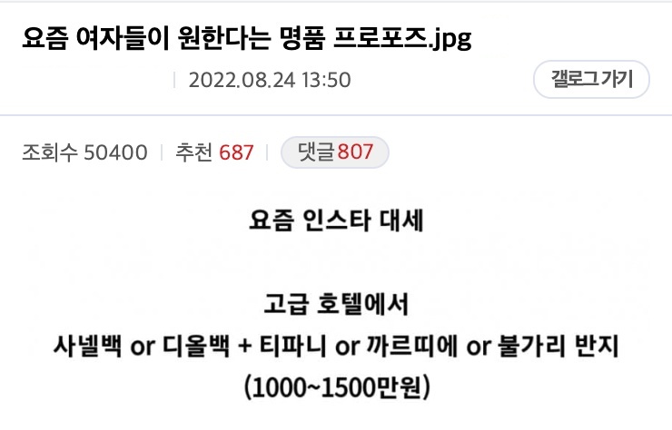 해당 게시글을 올린 작성자 A씨는 “요즘 여자들이 원한다는 명품 프로포즈”라는 제목의 글로 많은 이들의 관심을 끌었다.