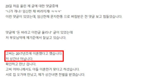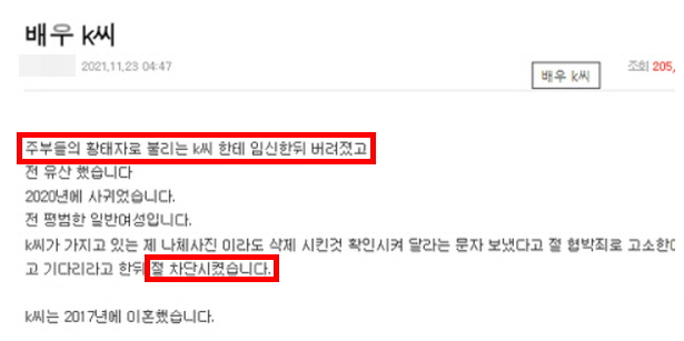 A씨가 지난 해 ”임신 후 버려졌다”는 내용을 글을 게시했지만, 톱배우가 죄송하다는 입장문만 공개 후 잠적했다.