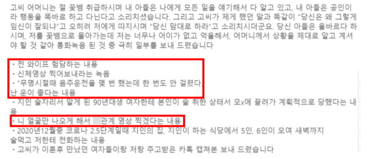 이외에도 전 와이프 험담하는 내용, 신체영상 찍어보내라는 녹음, 무명시절 음주운전을 몇 번 했는데 한 번도 안 걸렸다는 내용, 니 얼굴만 나오게 해서 잠자리 영상을 찍겠다는 내용 또한 통화 녹음이 있다고 밝혔다.