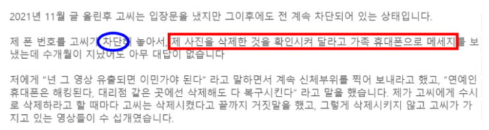 고세원이 A씨의 연락을 차단한 것 같다며, ”가족 휴대폰으로 내 사진을 삭제했는지 확인해달라”고 요구했지만 들어주지 않았다고 한다.