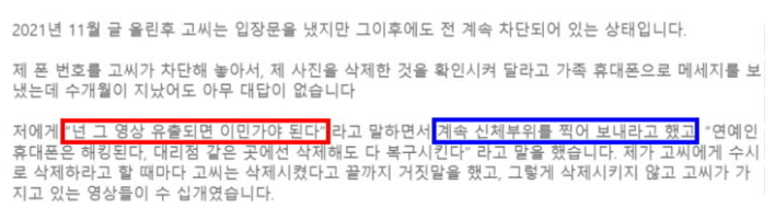 과거 고세원은 찍어 둔 영상이 유출되면 이민을 가야한다고 협박했다고 한다.