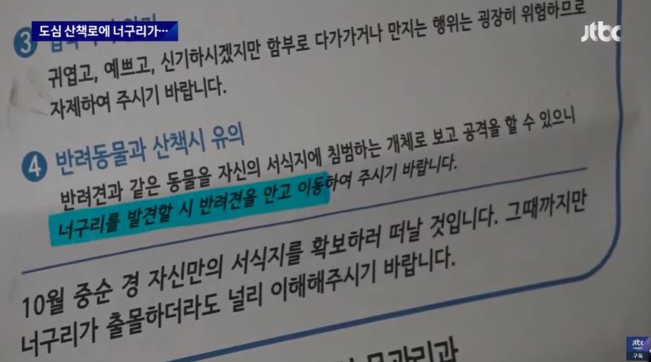 산책하다 너구리를 만나면 일단 개를 안고 피하라, 안내도 해놨는데,한 주민은 “허스키 데리고 다니는 여자분이 너구리들이 튀어나와서 강아지를 공격했다. 남자분들이 달려와서 쫓아냈다”며 목격담을 전했다.