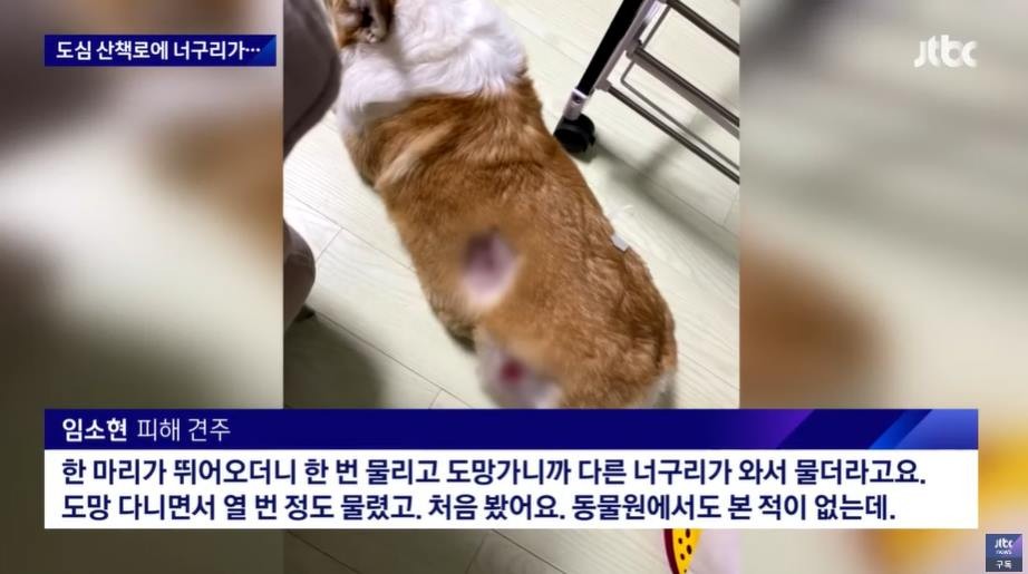 피해 견주는 당시에 대해 “한 마리가 뛰어오더니 한 번 물리고 도망가니까 다른 너구리가 와서 물었다”라며 도망 다니면서 열 번 정도 물렸다고 설명했다.