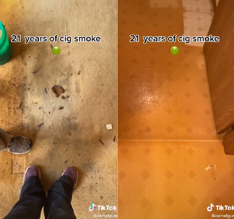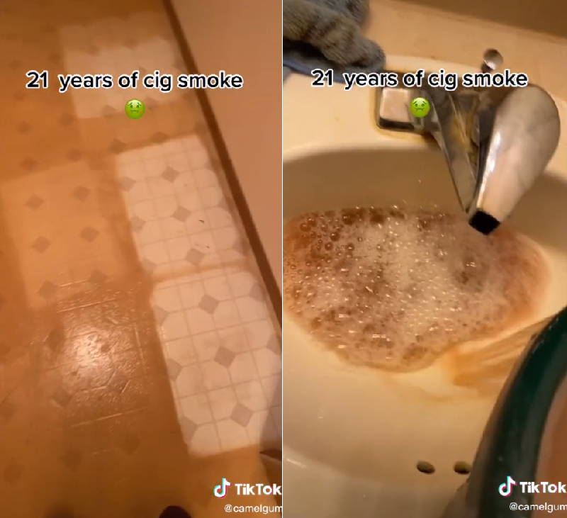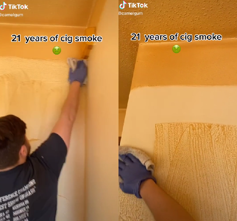 이 곳은 21년 동안 흡연한 남성이 살던 집으로 담배 연기가 벽과 바닥에 달라붙어 원래의 색을 알아볼 수 없을 정도로 색이 변한 것. 바닥 역시 가구가 놓여 있는 부분 빼고는 갈색빛으로 착색돼 있다.