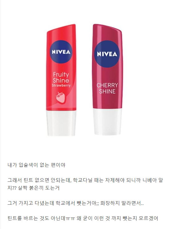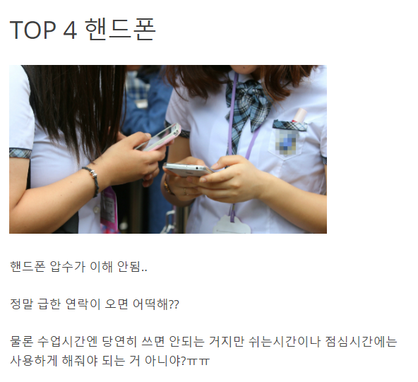 .” “민주주의 사회에서 자신의 돈으로 즉 개인적으로 구입한 물품들을 관리 지도하는 건 이해가 안가긴 함” “물론 난 화장도 안했지만 뺏기는 친구들 보면 굳이 왜 뺏는거지 하는 생각이 더 컸음” 라는 등의 반응을 보였다.