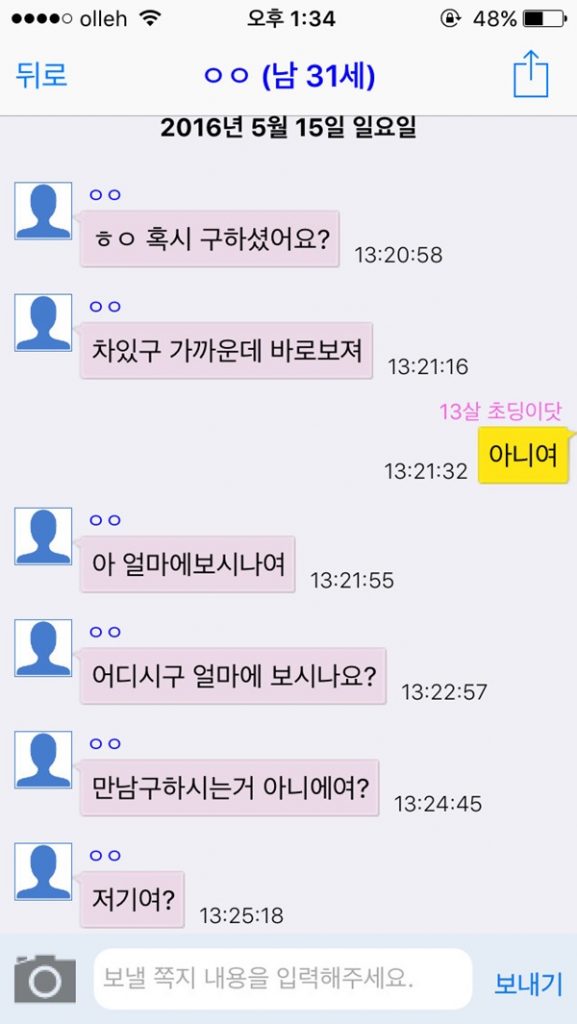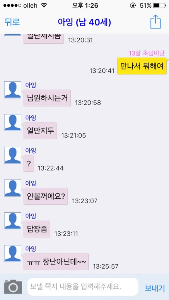 20대 초중반의 남성들이 “어디사세요? 개인?” “초딩이에요?” “간단 가능한가여” “오빠랑 차에서 놀까?” “정기적으로 돈 지원하고 싶어요” “지금바로 가능해요 차있으니..”라는 등의 충격적인 메시지를 공개했다.