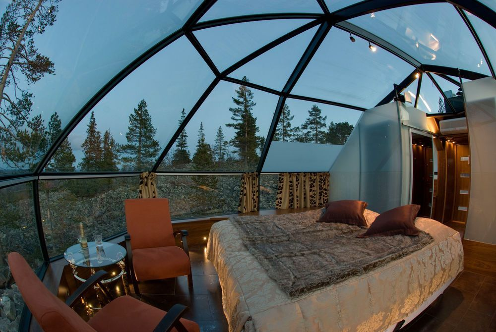 전면이 투명한 유리로 되어있어 침대에서 오로라를 그대로 감상할 수 있다.