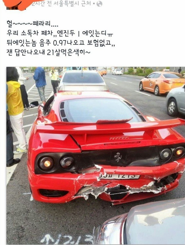 사고를 낸 가해자는 술을 마시고 렌트 차량으로 운전을 하다 페라리를 뒤에서 박았다고 한다.