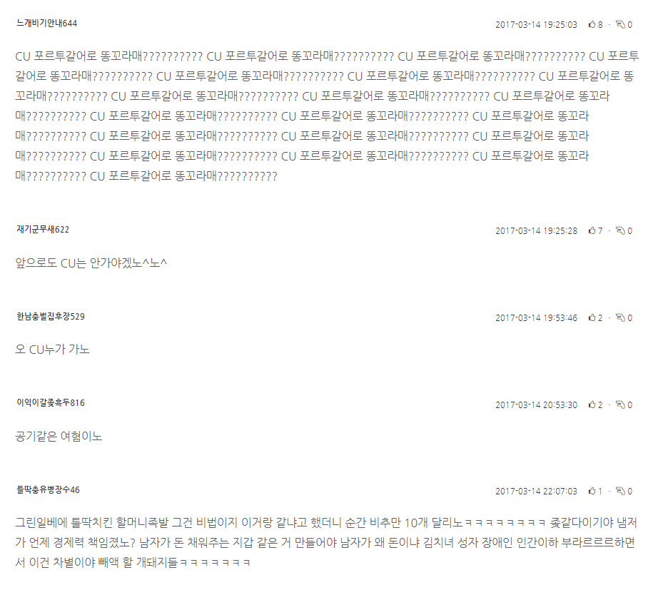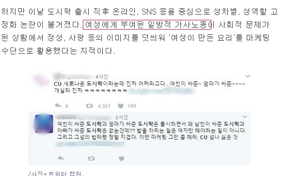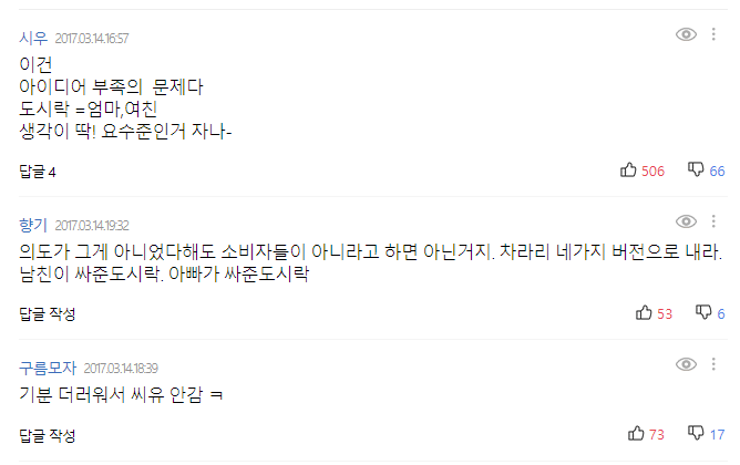 CU의 여혐 도시락의 경우 ‘여친이 싸준 도시락’과 ‘엄마가 싸준 도시락’을 출시하자 여초 커뮤니티에서 “왜 여친과 엄마만 도시락을 싸주는 주체로 표현한 것이냐”며 “여성 혐오를 부추긴다”는 말도 안되는 지적을 했다.