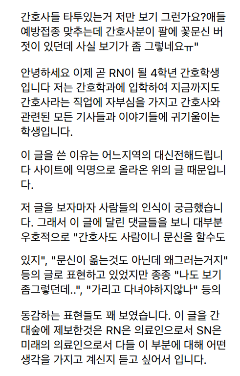 그는 커뮤니티 페이지에 “간호사들 타투 있는 거 저만 보기 그런가요? 애들 예방접종 맞추는데 간호사분이 팔에 꽃 문신 버젓이 있던데 사실 보기가 좀 그렇네요”라는 의견이 올라왔다고 전했다.
