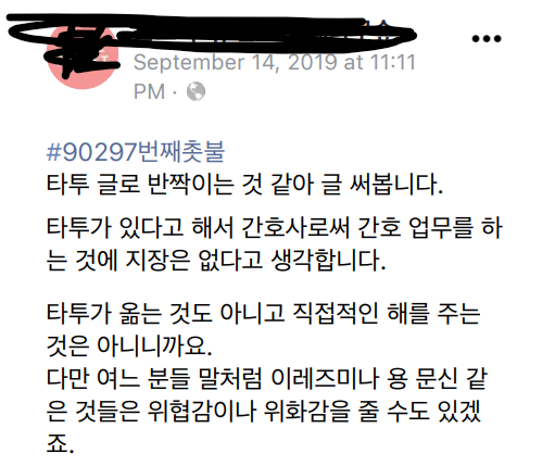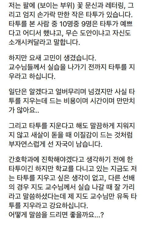 작성자에 따르면 커뮤니티에는 “간호사도 사람이니 문신을 할 수도 있지” 같은 타투를 하는 것은 자유라는 의견도 있었지만 “가리고 다녀야 하지 않나”라는 부정적인 의견도 있었다.