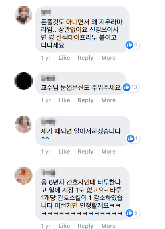 페이스북 페이지 이용자들은 대체로 타투는 간호사 업무와 무관하다고 말했다. 그들은 “타투로 간호하냐고”, “꼰대다 진짜” 같은 반응을 드러냈다. 일부 이용자들은 “오래된 기성세대 생각을 부정할 수 없다”며 환자들이 타투를 부정적이게 볼 수도 있다는 의견도 있었다.