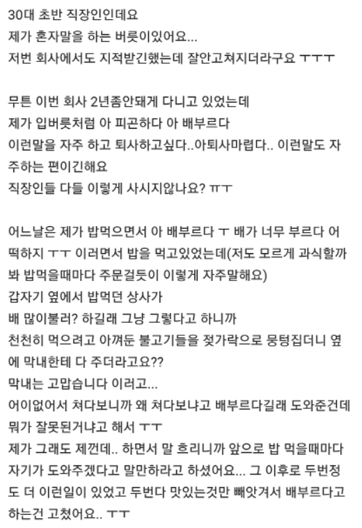 해당 게시물에 따르면 직장인 A씨는 평소 혼잣말을 하는 버릇이 있었는데, 이전 회사에서도 부정적인 혼잣말에 대해 지적을 받았지만, 잘 고쳐지지 않아 곤란을 겪고 있다.