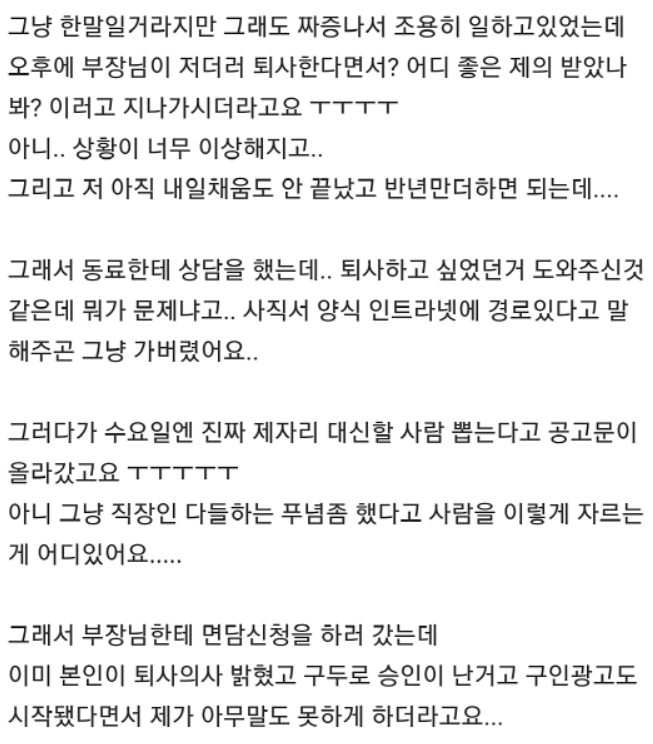 A씨는 부장에게 면담을 신청했지만, 부장 역시 “이미 본인이 퇴사 의사를 밝혔다. 구두로 승인도 났고 구인 광고도 시작됐다”며 A씨가 아무 말도 하지 못하게 만들었다.