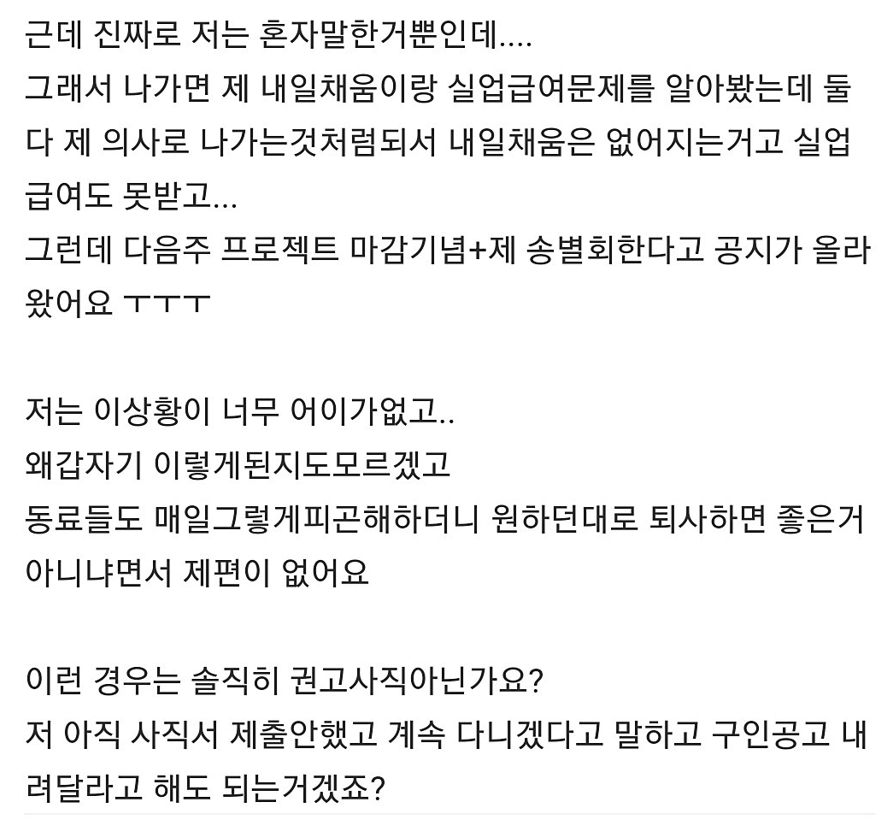이어 “동료들도 ‘매일 그렇게 피곤해 하더니 원하던 대로 퇴사하면 좋은 거 아니냐’며 제 편을 들어주지 않는다”며 “이런 경우는 솔직히 권고사직 아니냐. 저 아직 사직서 제출 안했다. 계속 다니겠다 말하고 구인공고 내려달라 해도 되는 것 아니냐”고 물었다.