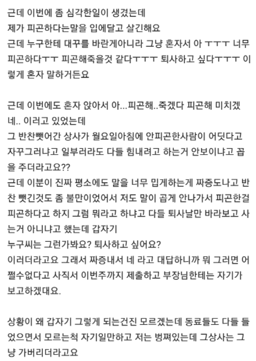 A씨는 “누구한테 대꾸를 바란 게 아니다. 그냥 혼자서 ‘아 너무 피곤하다’, ‘피곤해 죽을 것 같다’, ‘퇴사하고 싶다’ 이렇게 혼자 말을 한 것”이라 설명했다.