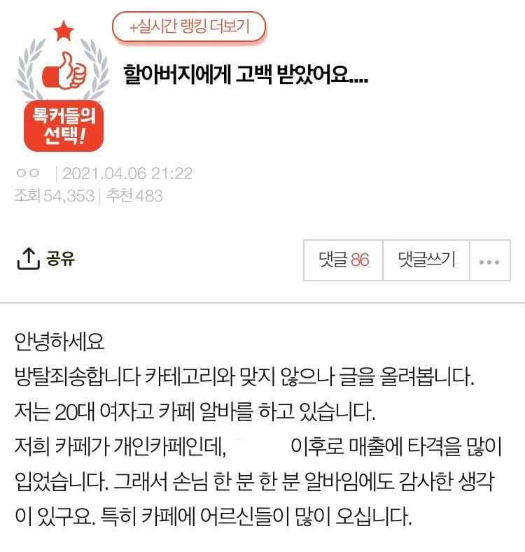 이어 “그러던 오늘 (할아버지가) 카운터 앞에서 갑자기 두 손을 덜덜 떠시더니 ‘사랑해요. 저랑 사귀어요’ 하셨다”고 덧붙였다.
