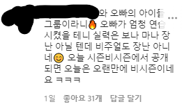 이를 보고 네티즌 들은”와 오빠의 아이돌 그룹이라니? 오빠가 엄청 연습 시켰을 테니 실력은 보나 마나 장난 아닐 텐데 비주얼도 장난 아니네? 오늘 시즌비시즌에서 공개되면 오늘은 오랜만에 비시즌이네요 ㅋㅋㅋ”, “오오!❣️멋진 그룹이네요❣️ 응원할게요” 라는 반응을 보였다.