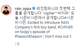 비는 자신의 인스타그램을 통해 “레인컴퍼니의 첫 번째 그룹을 공개합니다”라며 “‘ciipher’ ‘싸이퍼’ 오늘 시즌비시즌에서 공개합니다”라는 글과 사진을 공개했다.