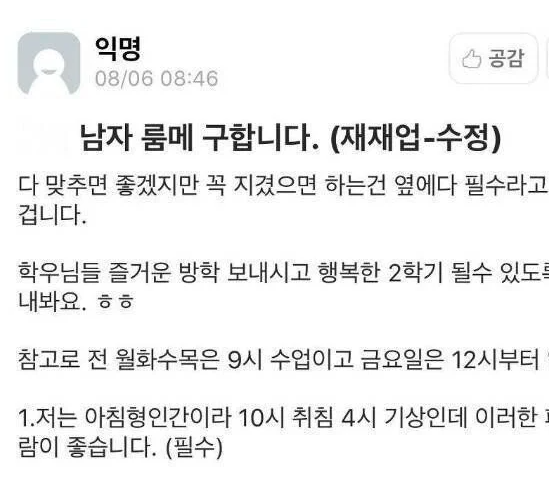 에브리타임에 올라온 “남자 룸메 구합니다”라는 글이 올라왔는데 한 남성이 자신과 함께 기숙사에서 지낼 룸메이트를 구하는 글인데 조건이 매우 까다롭고 충격적이기에 이렇게 논란이 됐다.