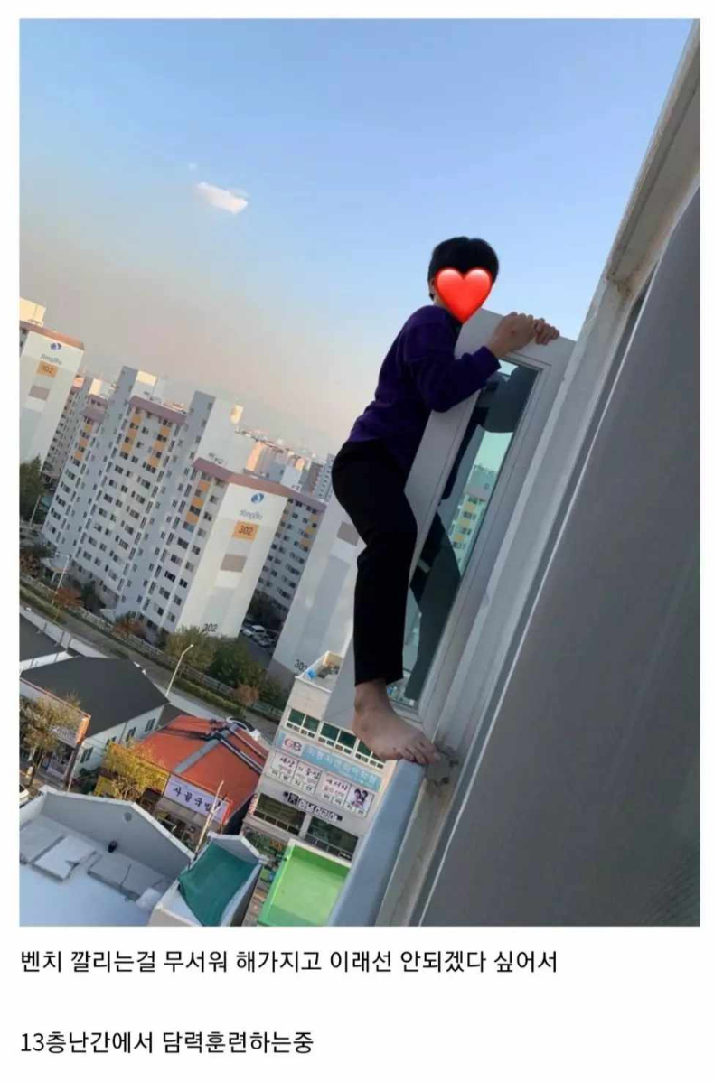 A씨는 “벤치 프레스에 깔리는 걸 무서워해서 이래서는 안 되겠다 싶어서 13층 난간에서 담력훈련하는 중”이라고 전했다.