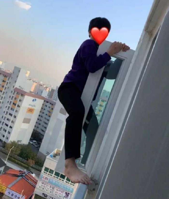 공개된 사진 속 남성은 베란다 창문에 매달려 두 손으로 창틀을 잡고 있다. 그러나 아무런 안전장치를 하지 않아 하마터면 큰 사고로 이어질뻔했다.
