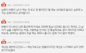 이를 접한 누리꾼들은 “남편이 바람 났나보다” “계산은 왜 안하고 가죠? 먹는건 정떨어지지만 계산은 너가해라? 남자 웃기지도 않네”라며 비난을 했다.