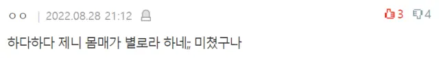 그러나 일부는 “저 정도면 몸매 엄청 좋은거 아님?”, “하다하다 제니 몸매가 별로라 하네;;미쳤구나” 등의 반응을 보였다.