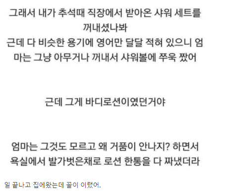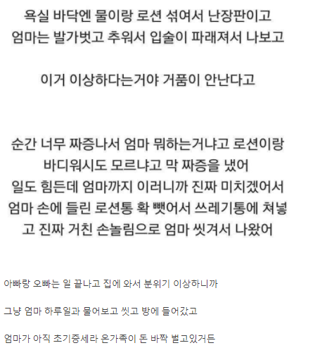 A씨는 “오늘 어떤 일이 있었냐면 엄마가 샤워를 하시는데 굳이 새 바디워시를 쓰고싶으셨나봐 치매 초기 진단 받으신 후에 자꾸 새것에 집착하시거든”라면서 글을 이어갔다.