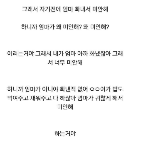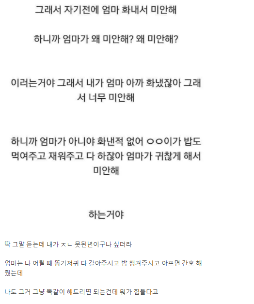 이를 접한 누리꾼들은 “진짜 처음 읽으면서 무덤덤했는데 미안하다고 할 때부터 진짜 삼십분동안 눈물이 안멈춘다 어떡하지.