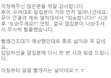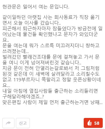 “지금 빨래 건조대 때문에 집 안에 갇혀있어요” (+꿀팁) 집에 있는데 집에 갇혀버렸다. ADVERTISEMENT . 집 안에 혼자 있다가 낭패를 겪어 본 경험이 있을 것이다. 작게는 화장실에 수건이나 휴지가 없다거나 손이 부족해서 모든 물건들을 쏟아버렸을 수도 있다. 혹시 집에 구해줄 사람이 없어서 집안에 꼼짝없이 갇혀버리게 된 적도 있는가. ADVERTISEMENT 듣기만 해도 끔찍한 이 일을 경험한 한 네티즌이 과거 온라인 커뮤니티에 올려 크게 화제를 모았다. 온라인 커뮤니티 ADVERTISEMENT +) 현관 밖에서 문 절대 못 따게 하는 방법 ADVERTISEMENT 온라인 커뮤니티 ADVERTISEMENT